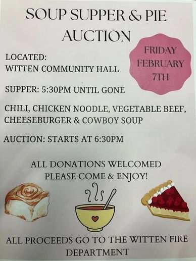 Join us for a fun and delicious evening at the Soup Supper & Pie Auction on Friday, February 7th, at the Witten Community Hall! 🍲🥧