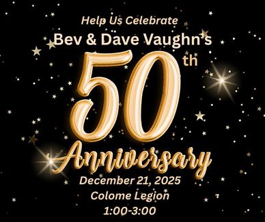 Join us in celebrating Bev & Dave's 50th wedding anniversary! We will be having snacks and cake in honor of their golden anniversary.