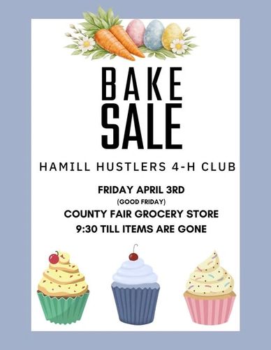 Hamill Hustlers 4-H Club is hosting a bake sale on Friday, April 3rd (Good Friday) at County Fair Grocery Store. The sale starts at 9:30 a.m. and runs until items are sold out.