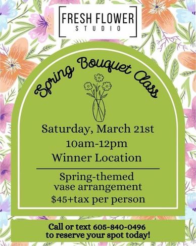 Remember to sign up for our spring bouquet class next weekend! We’ll be making colorful arrangements filled with flowers like tulips, freesia, stock, and ginestra! Cost is $45. Call or text 605-840-0496 to register!