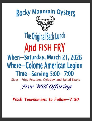 The Colome American Legion will host its Rocky Mountain Oysters – The Original Sack Lunch and Fish Fry on Saturday, March 21, 2026. Serving will run from 5:00 to 7:00 p.m., giving everyone plenty of time to stop by and enjoy a hearty meal with friends and neighbors.
