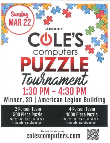 Cole's Computers is putting on a Puzzle Tournament in Winner on March 22nd. See attached flyer for more details!