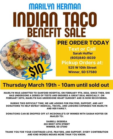 We are hosting an Indian Taco Benefit Sale on Thursday, March 19th, starting at 10 am (until sold out).